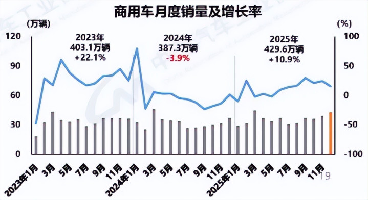 2025年,商用车产销分别为426.1万辆和429.6万辆,同比分别增长12%和10.9%。产销规模重回400万辆,说明商用车市场逐步回暖,抗压增强,超过年初预期。