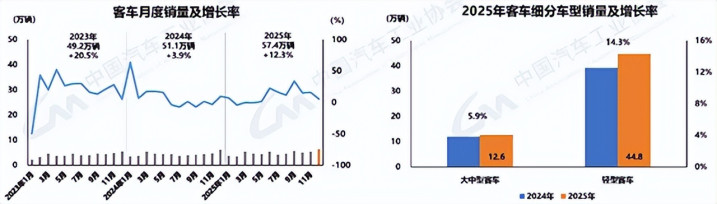 客车2025年产销56.8万辆和57.3万辆,同比增长12%和13.2%。其中,轻型客车44.8万辆,同比增长11.7%;大中型客车12.5万辆,同比下降6.4%。轻客占客车销售七八成,乃是客车销售的主力军。